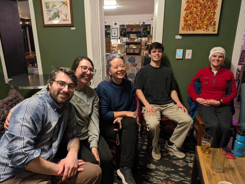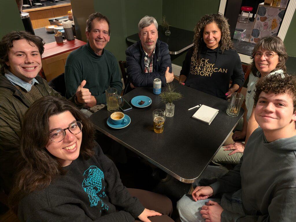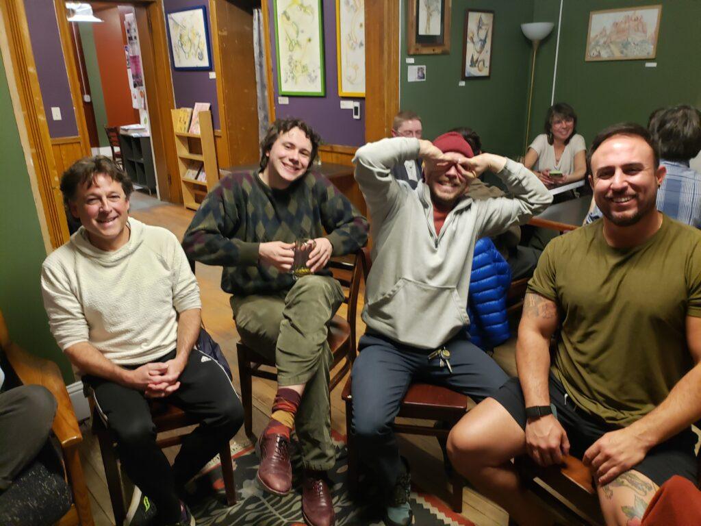 Toda la banda fue muy animada esta noche. Fue una reunión de mucha plática y mucha risa. Chris nos ofreció muchos detalles interesantes sobre su viaje a Puerto Rico y luego Colombia. Ethan compartió su interés en hacer “todo, afuera de la casa”, que quiere decir muchas actividades a la intemperie. Ryan tuvo éxito en relatar unas instrucciones, según él “basicas”, a uno de sus clientes… ¡en español! ¡Felicitaciones Ryan!