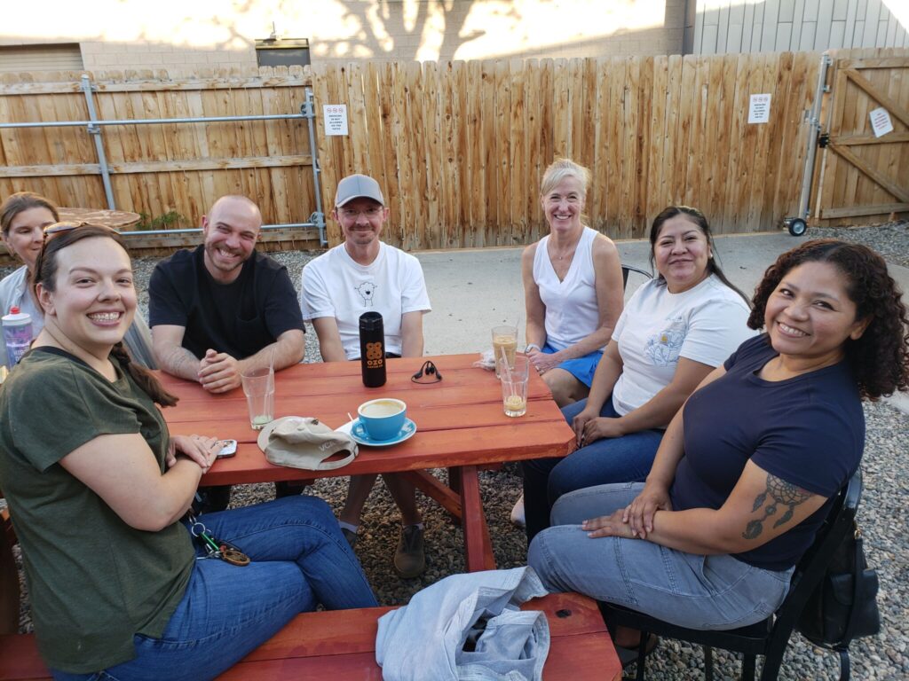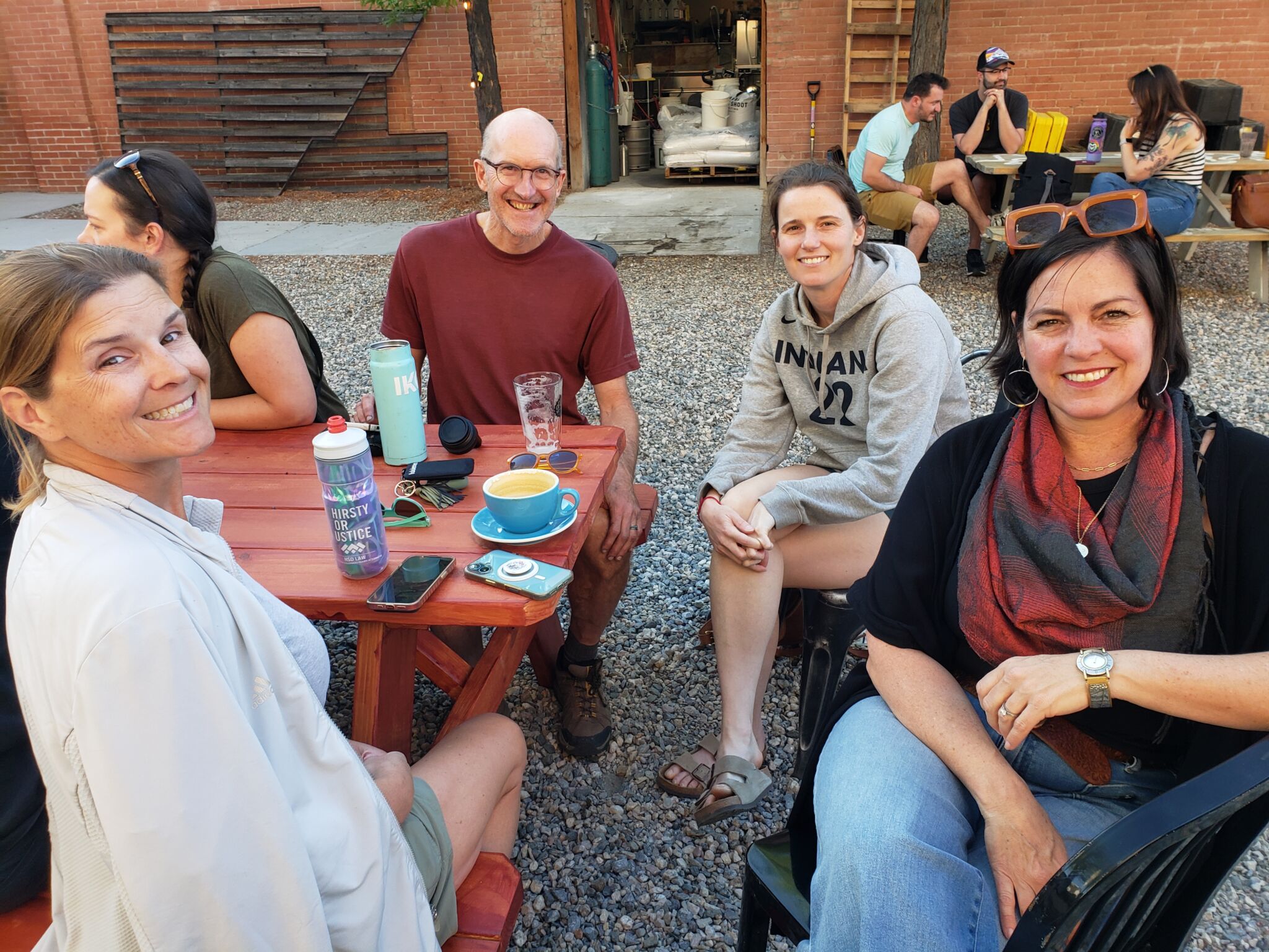 El patio detrás del café nos sirve muy bien para escuchar sin tanto eco como adentro.   Nos dividimos organicamente en grupitos como ves en las fotos.